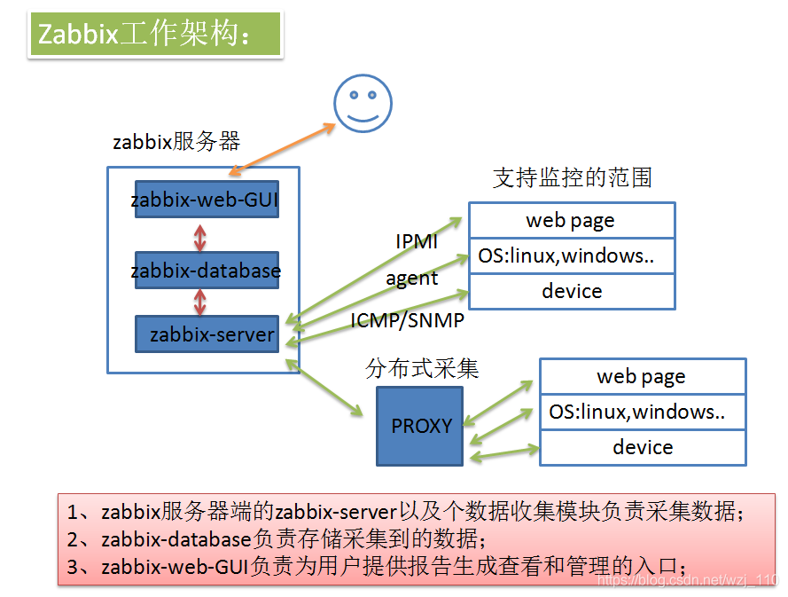 构成:zabbix由 2 部分构成zabbix server与可选组件zabbix agent